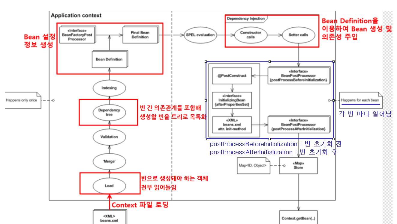 💡 참고로 빈의 라이프사이클은 크게 '객체생성 - 의존관계 설정 - 초기화 - 소멸' 의 순으로 나눈다.