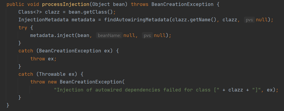 이를 processInjection 메서드가 빈의 클래스 정보를 읽어와서 (getClass()) 자동(auto)으로 의존관계를 설정할 메타데이터를 얻고 주입(inject()) 하는 것이다.